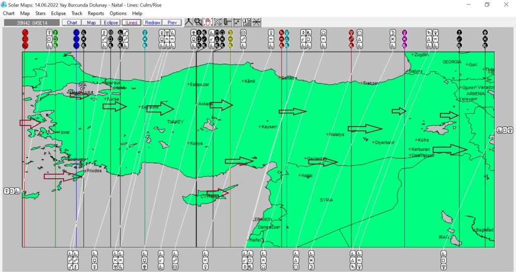 Yukarıda 14 Haziran günü Yay burcunda meydana gelecek dolunayın ülkemize ait haritasını görmektesiniz. Harita üzerinde işaretli hatlar ve çevresi, dolunay enerjisinden belirgin etkilenmesi olasu yerlerdendir.