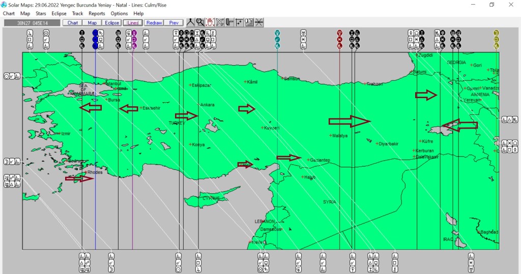 Yukarıda Yengeç burcunda gerçekleşecek yeniaya ait ülkemizin astrokartografik haritasını görmektesiniz. Harita üzerinde işaretli hatlar ve çevresi, yeniay enerjisinden belirgin etkilenmesi olası yerlerdendir.