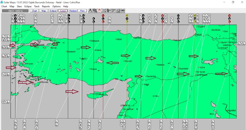 Yukarıda Oğlak burcunda gerçekleşecek dolunaya ait ülkemizin astrokartografik haritasını görmektesiniz. Harita üzerinde işaretli hatlar ve çevresi, dolunay enerjisinden belirgin etkilenmesi olası yerlerdendir.