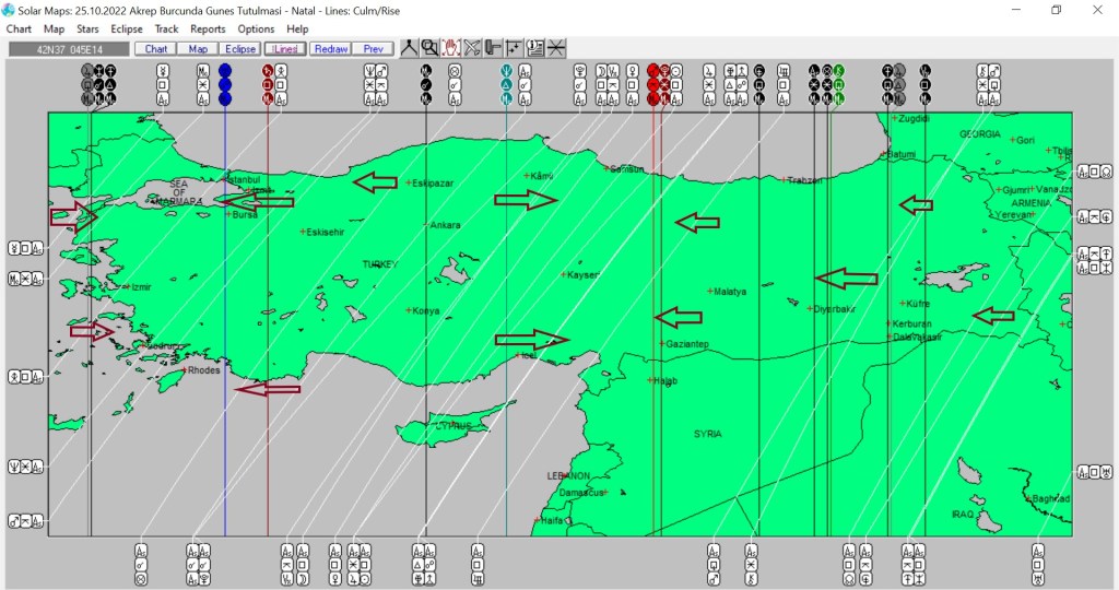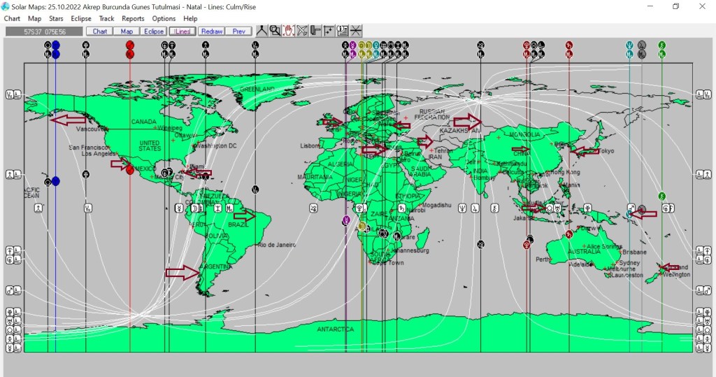 Yukarıda Akrep burcundaki Güneş tutulmasının dünyaya, aşağıda ise ülkemize ait astrokartografik haritalarını görmektesiniz. Harita üzerinde işaretli hatlar ve çevresi, tutulma enerjilerinden belirgin etkilenmesi olası yerlerdendir.