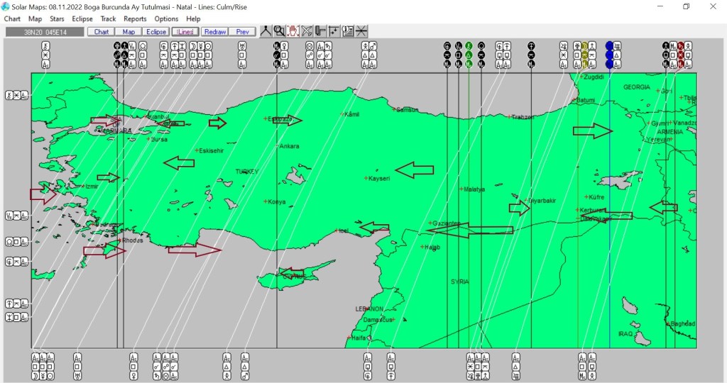 Yukarıda Boğa burcunda yaşanacak olan Ay tutulmasının dünyaya, aşağıda ise ülkemize ait astrokartografik haritalarını görmektesiniz. Harita üzerinde işaretli hatlar ve çevresi, tutulma enerjilerinden belirgin etkilenmesi olası yerlerdendir.