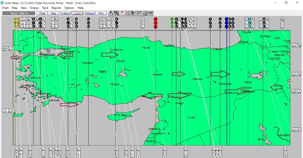 Yukarıda Oğlak burcunda yaşanacak olan yeniayın, ülkemize ait astrokartografik haritasını görmektesiniz. Harita üzerinde işaretli hatlar ve çevresi, dolunay enerjisinden belirgin etkilenmesi olası yerlerdendir.Azade Öksoy