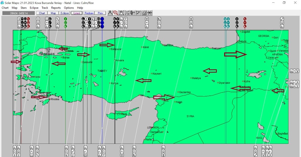 Yukarıda Kova burcunda gerçekleşecek yeniayın, ülkemize ait astrokartografik haritasını görmektesiniz. Harita üzerinde işaretli hatlar ve çevresi, dolunay enerjisinden belirgin etkilenmesi olası yerlerdendir.