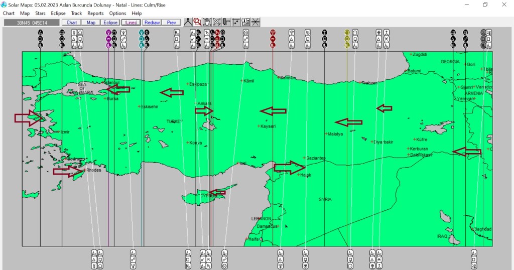 Yukarıda Aslan burcunda gerçekleşecek dolunayın, ülkemize ait astrokartografik haritasını görmektesiniz. Harita üzerinde işaretli hatlar ve çevresi, dolunay enerjisinden belirgin etkilenmesi olası yerlerdendir.