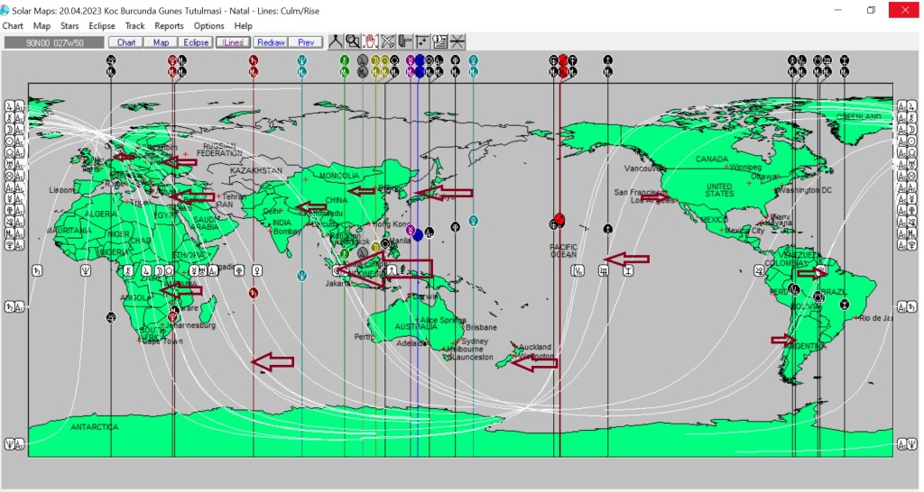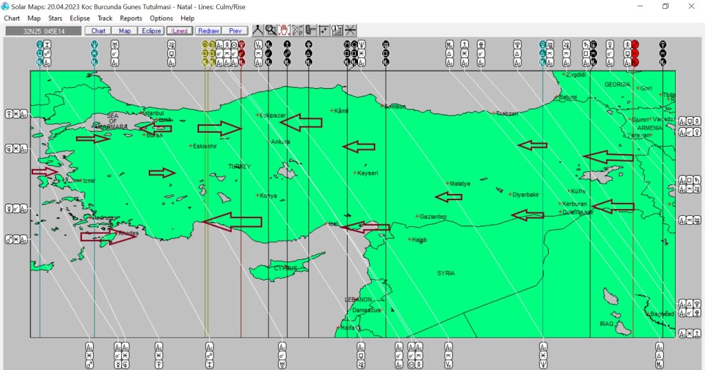 Yukarıda 20 Nisan günü Koç burcunda meydana gelecek Güneş tutulmasının dünyaya, aşağıda ise ülkemize ait astrokartografik haritalarını görmektesiniz. Harita üzerinde işaretli hatlar ve çevresi, dolunay enerjisinden belirgin etkilenmesi olası yerlerdendir.