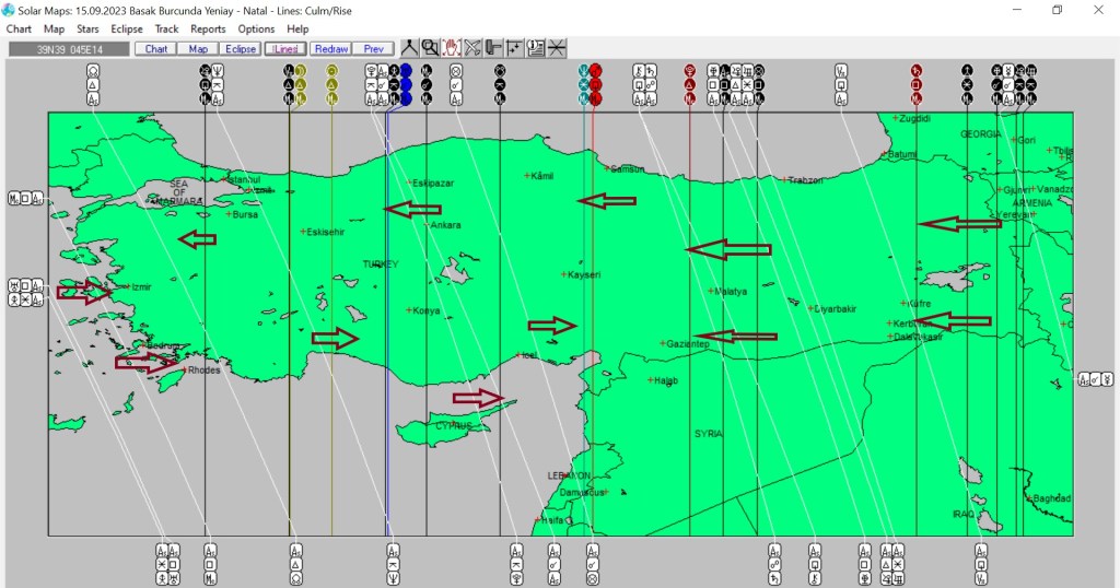 Yukarıda 15 Eylül günü Başak burcunda yaşanacak yeniayın ülkemize ait astrokartografik haritasını görmektesiniz. Harita üzerinde işaretli hatlar ve çevresi, dolunay enerjisinden belirgin etkilenmesi olası yerlerdendir.