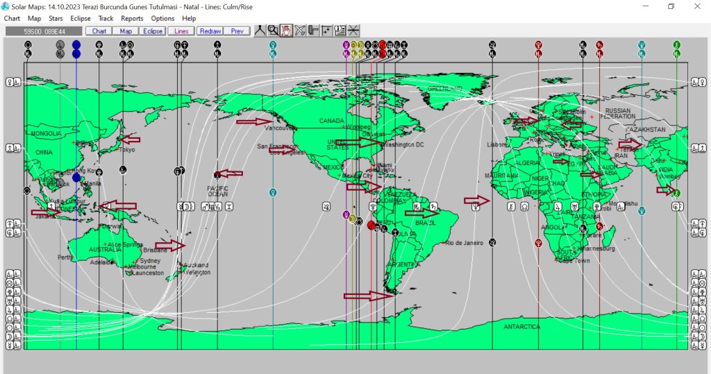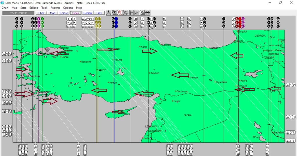 Yukarıda 14 Ekim günü Terazi burcunda yaşanacak Güneş tutulmasının dünyaya, aşağıda ise ülkemize ait astrokartografik haritalarını görmektesiniz. Harita üzerinde işaretli hatlar ve çevresi, tutulma enerjisinden belirgin etkilenmesi olası yerlerdendir.
