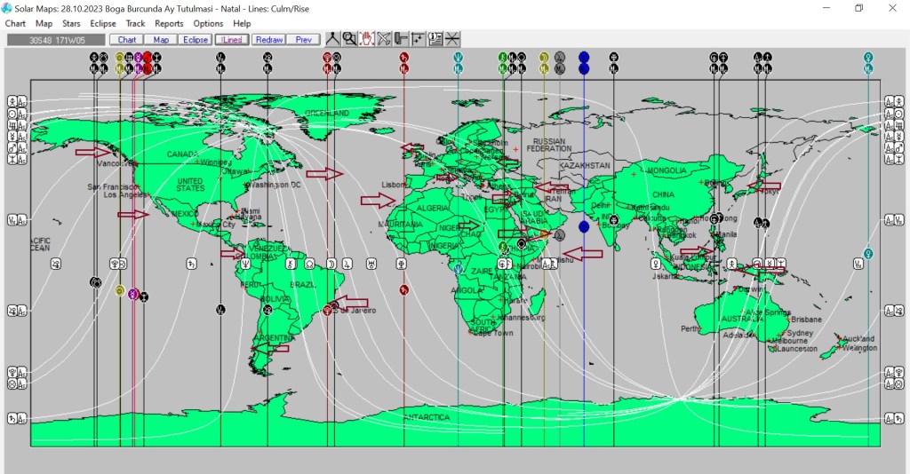 Yukarıda 28 Ekim günü Boğa burcunda yaşanacak Ay tutulmasının dünyaya, aşağıda ise ülkemize ait astrokartografik haritalarını görmektesiniz. Harita üzerinde işaretli hatlar ve çevresi, tutulma enerjisinden belirgin etkilenmesi olası yerlerdendir.