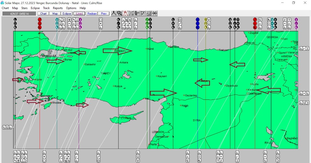Yukarıda 27 Aralık günü Yay burcunda gerçekleşecek olan dolunayın ülkemize ait astrokartografik haritasını görmektesiniz. Harita üzerinde işaretli hatlar ve çevresi, tutulma enerjisinden belirgin etkilenmesi olası yerlerdendir.