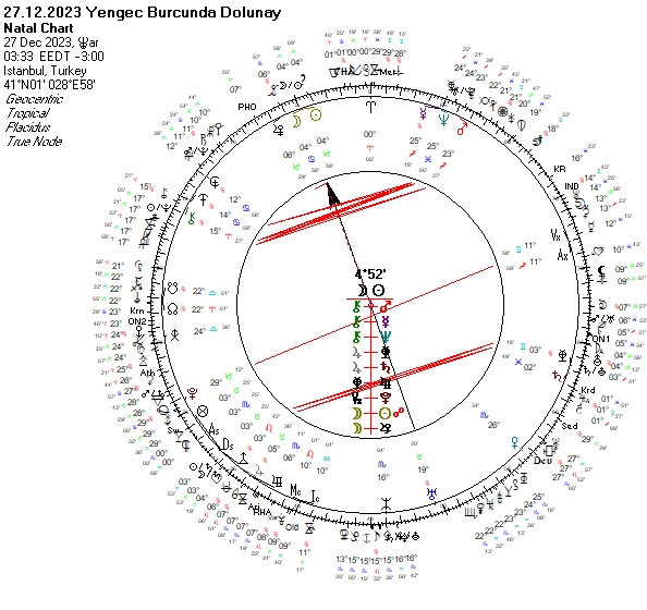 27 Aralık günü saat 03:33’de Yengeç burcunun 04°58’ derecesinde dolunay meydana gelecek. Ev sahipliği yapacak olan Yengeç vatan, millet konuları anlattığı gibi anaç, hassas, tutucu, ailesine düşkündür. Gölgesinde ajitasyon, kıskançlık görülür. Halkla ilgili konuların yanı sıra sağlık, konaklama, otel, emlak, gıda, yiyecek, içecek, catering sektörü, çocuklarla ilgili işleri, psikologlar, tarihçiler, antikacılar ve kamu hizmetlerini de anlatır. Dolayısıyla dolunay döneminde Yengeç özelliklerini ve bu konulara ait gelişmeleri daha belirgin görebiliriz.