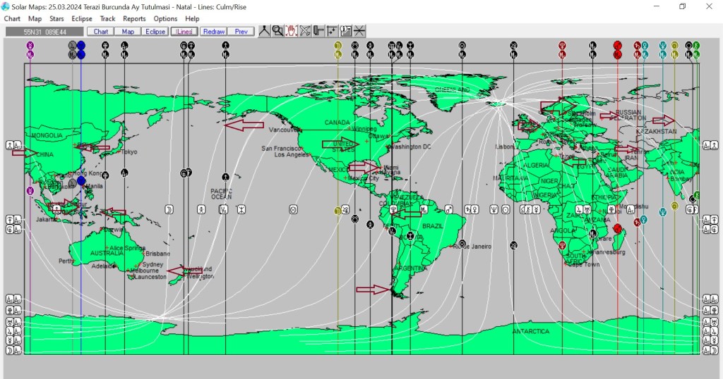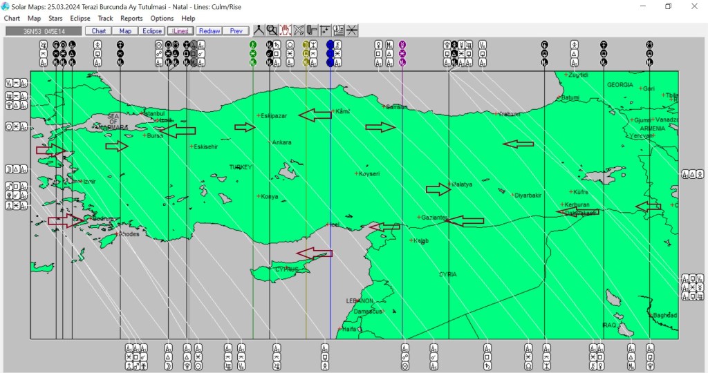 Yukarıda 25 Mart günü Terazi burcunda yaşanacak Ay tutulmasının dünyaya, aşağıda ise ülkemize ait astrokartografik haritalarını görmektesiniz. Harita üzerinde işaretli hatlar ve çevresi, tutulma enerjisinden belirgin etkilenmesi olası yerlerdendir.