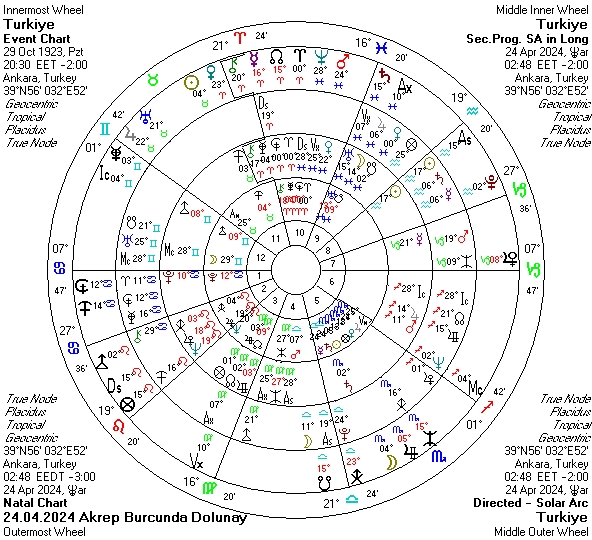 Türkiye’nin Güneş’i üzerinde olan dolunay, otorite, lider, bakanlar, muhalefet lider ve mensupları, gazeteci, yazar, düşün insanları, tanınmış kişilerle ilgili önemli gelişmelere dikkat çekmekte. Bu gelişmeler sağlık konularından, yetkinliklere, görev değişimlerine kadar uzanabilir. Operasyonlar ve davalar konu olabilir. Yerel seçimlerin ardından belediye ve belediye başkanlarını ilgilendiren konulara dikkat kesilebiliriz. Güç dönüşümleri, mafyatik bağlantılar gündeme oturabilir. Patlamalar, yangınlar, sulardan, denizlerden, sıvılardan, petro-kimya ürünlerinden kaynaklı sorunlar yaşanabilir. Dinler ya da çeşitli ideolojiler üzerinden yürütülmek istenen eylemler yükselebilir. 8 Mayıs’ta Boğa burcunda yaşanacak yeniaya giderken, mücadeleci, çatışmacı ortam da belirginleşebilir. Güvenlik açısından önem teşkil eden süreçten geçmekteyiz. Komşu, yakın çevre ülkelerdeki gelişmeler bizi de dikkatli olmaya sevk etmekte. Hava ve deniz yolları ile ilgili problemler yaşanabilir. Deprem olasıdır. Anayasa çalışmaları ve yapılabilirliği konuşulabilir.