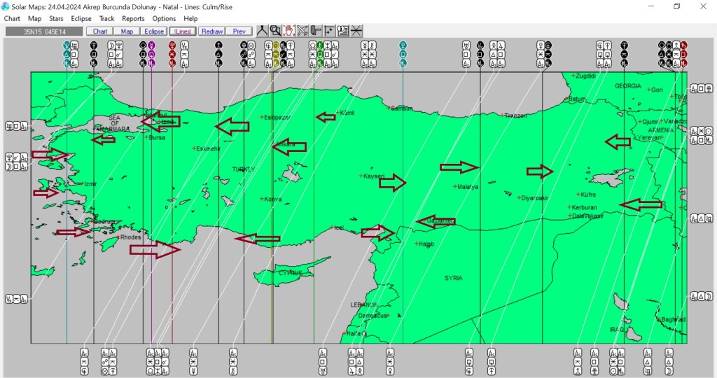 Yukarıda 24 Nisan günü Akrep burcunda meydana gelecek dolunayın astrokartografik haritasını görmektesiniz. Harita üzerinde işaretli hatlar ve çevresi, tutulma enerjisinden belirgin etkilenmesi olası yerlerdendir.
