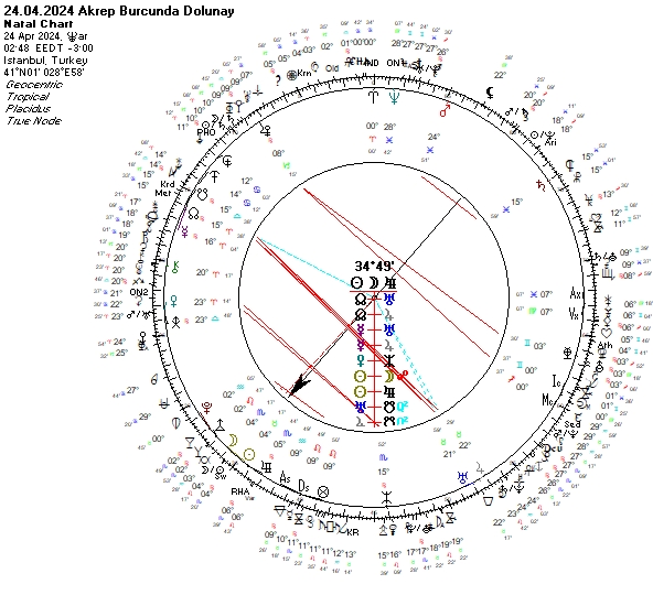 24 Nisan günü saat 02:48’de Akrep burcunun 04°17’ derecesinde dolunay meydana gelecek. Dolunayın ev sahibi Akrep sabırlı, ketum, kuşkucu, uçlarda dolaşmasıyla krizleri deneyipleyip, beslenen, yıkıcı doğadadır . Bankacılar, finansçılar, ekonomistler, sigortacılar, dedektifler, polisler, askerler, psikiyatristler, doktorlar, dişçiler, araştırmacılar, gazeteciler, madenciler, kimyacılar ve fizikçiler ile ilişkilidir. Dolayısıyla dolunay ile beraber Akrep özelliklerini ve bu gruplara ait gelişmeleri daha belirgin gözlemleyebiliriz.