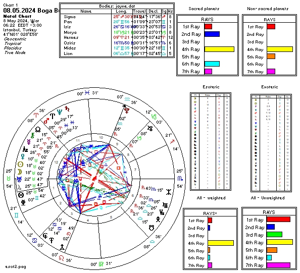 Yükselende yine yeniayın ev sahibi Boğa burcunu görmekteyiz ve bu burcun özelliklerini daha vurgulamakta. Bu dereceye şiddet, travmatik durumlar, boyun, boğaz bölgesi sorunlarını işaret eden Algol ve tutku, onur, karşı cins ilişkilerinde ve yüz bölgesinde problemlere yol açabilen Alcyone sabit yıldızlarının etkisi bulunmakta.