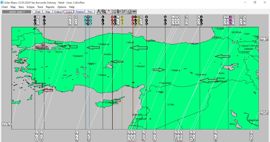 Yukarıda 23 Mayıs günü Yay burcunda meydana gelecek dolunayın astrokartografik haritasını görmektesiniz. Harita üzerinde işaretli hatlar ve çevresi, dolunay enerjisinden belirgin etkilenmesi olası yerlerdendir.