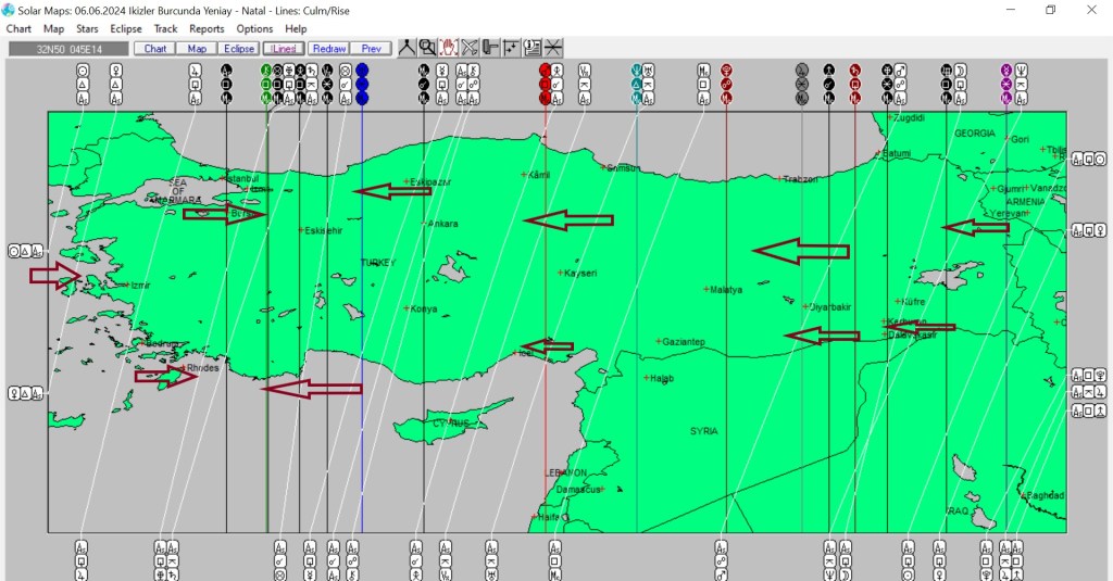 Yukarıda 6 Haziran günü İkizler burcunda meydana gelecek yeniayın astrokartografik haritasını görmektesiniz. Harita üzerinde işaretli hatlar ve çevresi, yeniay enerjisinden belirgin etkilenmesi olası yerlerdendir.