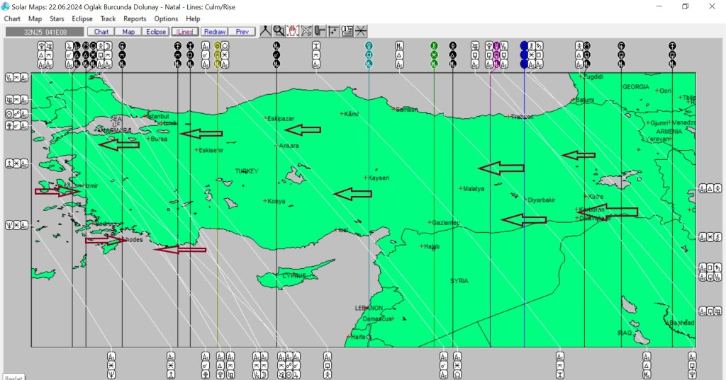 Yukarıda 22 Haziran günü Oğlak burcunda meydana gelecek dolunayın astrokartografik haritasını görmektesiniz. Harita üzerinde işaretli hatlar ve çevresi, yeniay enerjisinden belirgin etkilenmesi olası yerlerdendir.