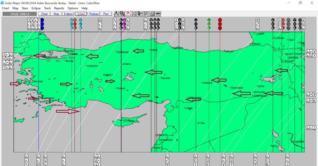 Yukarıda 4 Ağustos günü Aslan burcunda meydana gelecek yeniayın astrokartografik haritasını görmektesiniz. Harita üzerinde işaretli hatlar ve çevresi, yeniay enerjisinden belirgin etkilenmesi olası yerlerdendir.