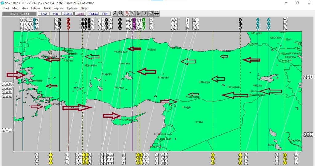 Yukarıda 31 Aralık günü Oğlak burcunda gerçekleşecek olan yeniaya ait astrokartografik haritayı görmektesiniz. Harita üzerinde işaretli hatlar ve çevresi, yeniay enerjisinden belirgin etkilenmesi olası yerlerdendir.