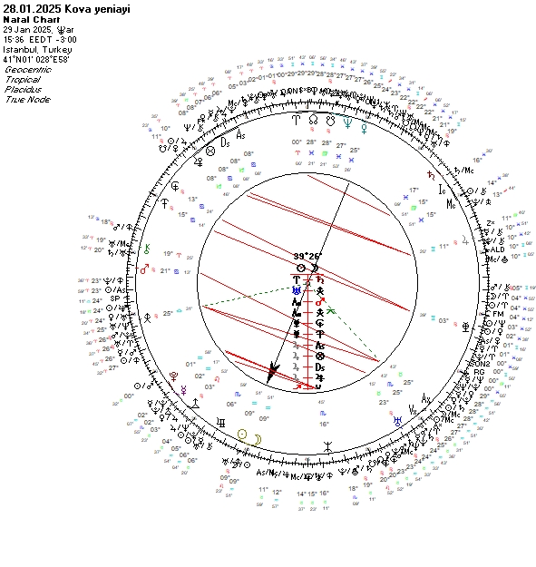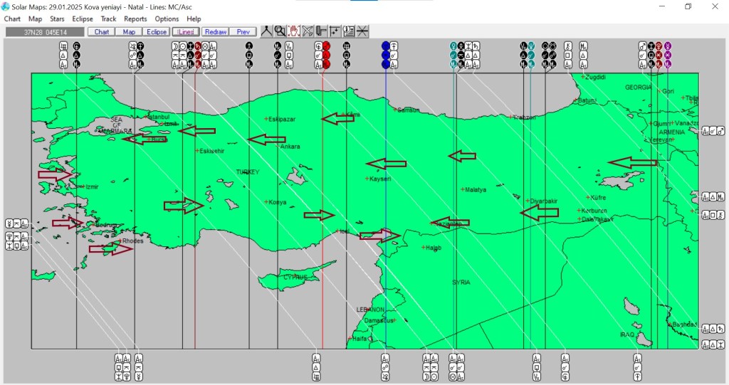 Yukarıda 29 Ocak günü Kova burcunda gerçekleşecek olan yeniaya ait astrokartografik haritayı görmektesiniz. Harita üzerinde işaretli hatlar ve çevresi, yeniay enerjisinden belirgin etkilenmesi olası yerlerdendir.