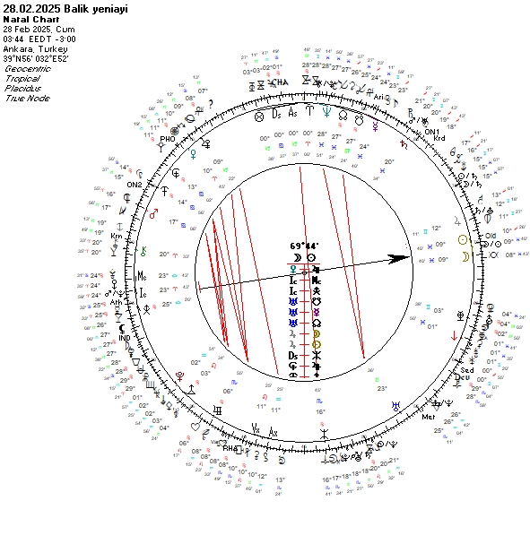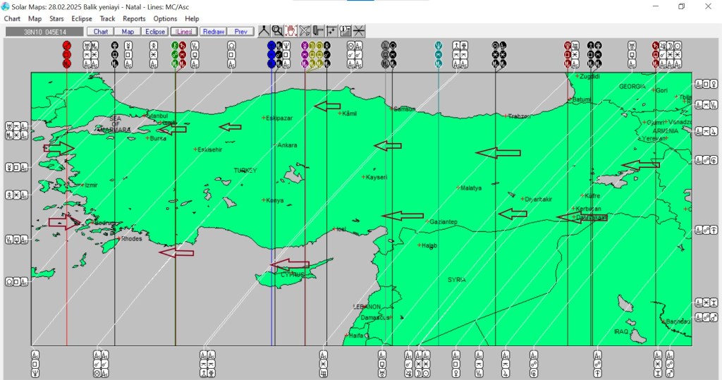 Yukarıda 28 Şubat günü Balık burcunda gerçekleşecek olan yeniaya ait astrokartografik haritayı görmektesiniz. Harita üzerinde işaretli hatlar ve çevresi, yeniay enerjisinden belirgin etkilenmesi olası yerlerdendir.