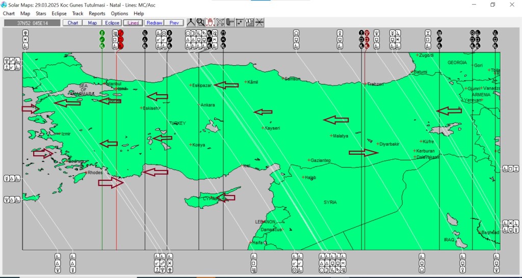 Yukarıda 29 Mart günü gerçekleşecek Koç burcundaki Güneş tutulmasının dünyaya, aşağıda ise ülkemize ait astrokartografik haritalarını görebilirsiniz. Haritalar üzerinde işaretli hatlar ve çevreleri, tutulma enerjilerinden daha belirgin etkilenmesi olası yerlerdir.