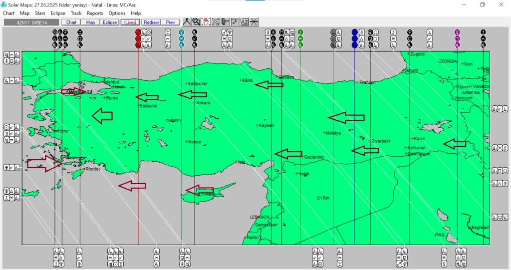 Yukarıda 27 Mayıs günü İkizler burcunda gerçekleşecek eniayın ülkemize ait astrokartografik haritasını görmektesiniz. Harita üzerinde işaretli hatlar ve çevreleri, dolunay enerjisinden daha belirgin etkilenmesi olası yerlerdir.
