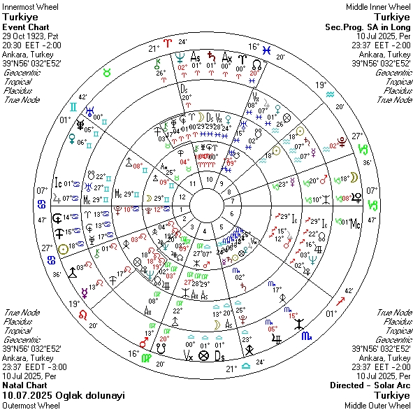 İç ve dış ilişkiler dengemizi ve bunların ekonomiye, halka, bürokrasiye yansımalarını gözlemleyeceğimiz bir dolunay süreci. İlerletilmiş Mars ve, Pluto, Chiron ile birlikte çalışan dolunay, güvenlik konularına dikkati çekmekte. Askeri durumlara, açık düşmanlıklara ve bunlardan ülke olarak zarar görmememiz için dikkatli olmamız gereken bir döneme işaret etmekte. Burada her türlü güvenlik konusu gündem olabileceği gibi yangınlara da dikkat etmeliyiz. Sınırımızda güvenlikle ilgili oluşabilecek soruna karşı daha dikkat etmek gerekebilir. İç tansiyona karşı da tedbiri elden bırakmamalı. Operasyonlar, güvenlik güçlerinin dahil olabileceği durumlar olasıdır. Bu süreçte yer kabuğundaki enerji birikimi de kendini hissettirebilir.