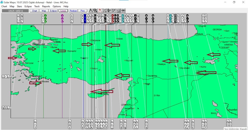 Yukarıda 10 Temmuz günü Oğlak burcunda gerçekleşecek dolunayın ülkemize ait astrokartografik haritasını görmektesiniz. Harita üzerinde işaretli hatlar ve çevreleri, dolunay enerjisinden daha belirgin etkilenmesi olası yerlerdir.