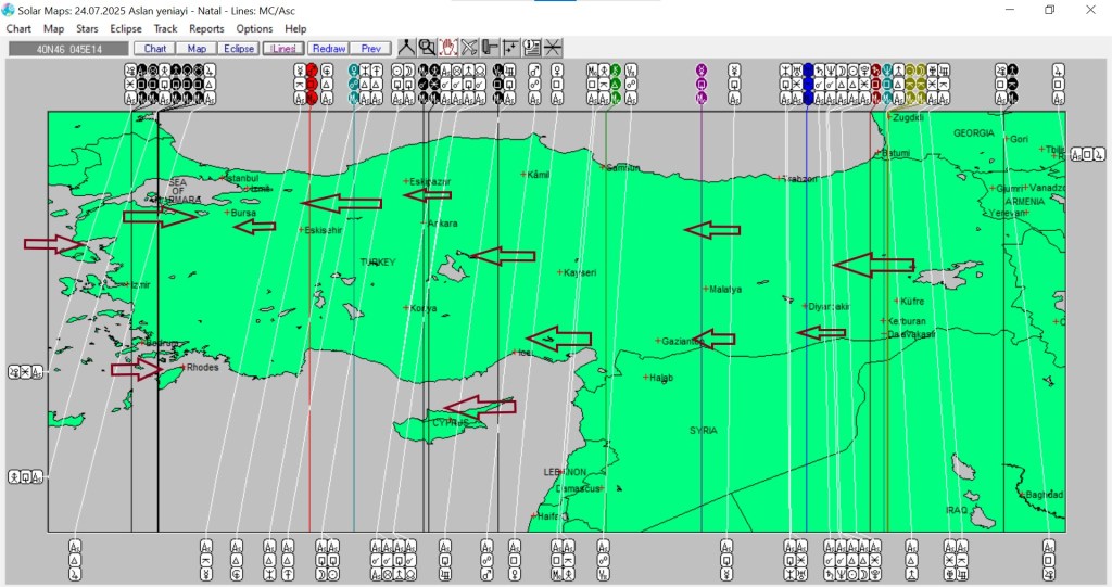 Yukarıda 24 Temmuz günü Aslan burcunda gerçekleşecek yeniayın ülkemize ait astrokartografik haritasını görmektesiniz. Harita üzerinde işaretli hatlar ve çevreleri, yeniay enerjisinden daha belirgin etkilenmesi olası yerlerdir.