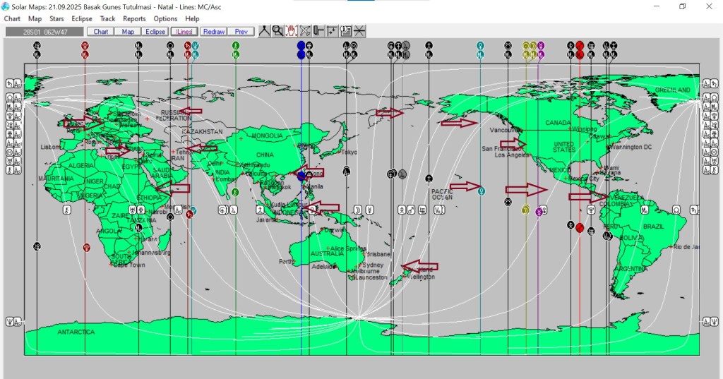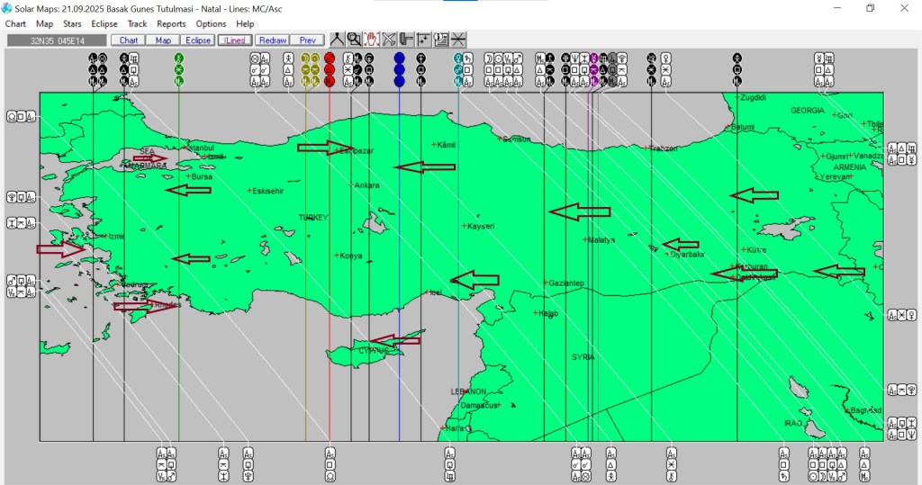Yukarıda 21 Eylül günü Başak burcunda gerçekleşecek Güneş tutulmasının dünya, aşağıda ise ülkemize ait astrokartografik haritalarını görmektesiniz. Haritalar üzerinde işaretli hatlar ve çevreleri, tutulma enerjisinden daha belirgin etkilenmesi olası yerlerdir.