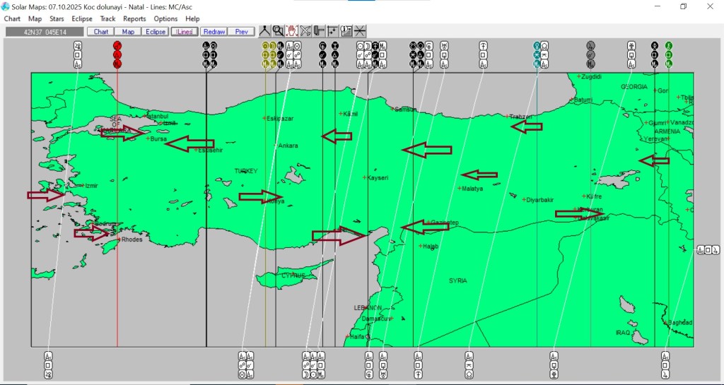 Yukarıda 7 Ekim günü Koç burcunda gerçekleşecek dolunayın ülkemize ait astrokartografik haritasını görmektesiniz. Harita üzerinde işaretli hatlar ve çevreleri, tutulma enerjisinden daha belirgin etkilenmesi olası yerlerdir.