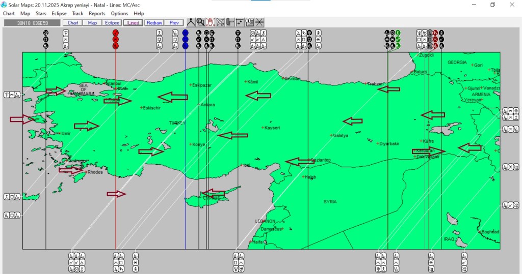 Yukarıda 20 Kasım günü Akrep burcunda gerçekleşecek yeniayın ülkemize ait astrokartografik haritasını görmektesiniz. Harita üzerinde işaretli hatlar ve çevreleri, tutulma enerjisinden daha belirgin etkilenmesi olası yerlerdir.