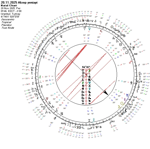 20 Kasım günü saat 09:46’da Akrep burcunun 28°11’ derecesinde yeniay gerçekleşecek. Ev sahibi Akrep ketum, kuşkucu, sabırlı, uçlarda dolaşarak krizleri deneyimleyen ve ondan beslenen, yıkıcı doğalıdır. Bankacılar, finansçılar, ekonomistler, sigortacılar, dedektifler, polisler, askerler, psikiyatristler, doktorlar, dişçiler, araştırmacılar, gazeteciler, madenciler, kimyacılar ve fizikçiler ile ilişkilidir. Dolayısıyla yeniayda Akrep özelliklerini ve bu gruplara ait gelişmeleri daha belirgin gözlemleyebiliriz.