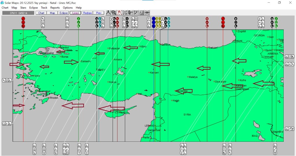 Yukarıda 20 Aralık günü Yay burcunda gerçekleşecek yeniayın ülkemize ait astrokartografik haritasını görmektesiniz. Harita üzerinde işaretli hatlar ve çevreleri, tutulma enerjisinden daha belirgin etkilenmesi olası yerlerdir.