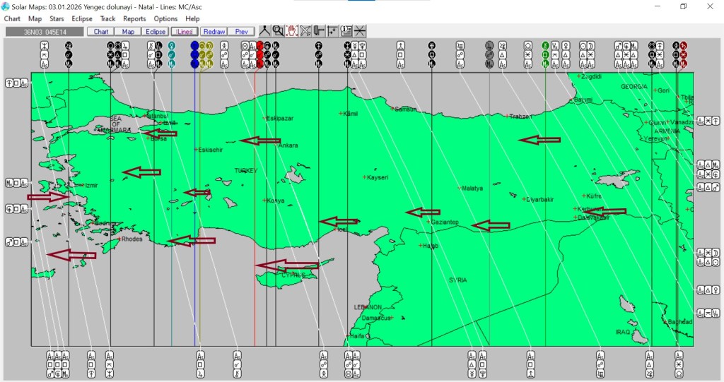 Yukarıda 3 Ocak günü Yengeç burcunda gerçekleşecek dolunayın ülkemize ait astrokartografik haritasını görmektesiniz. Harita üzerinde işaretli hatlar ve çevreleri, tutulma enerjisinden daha belirgin etkilenmesi olası yerlerdir.
