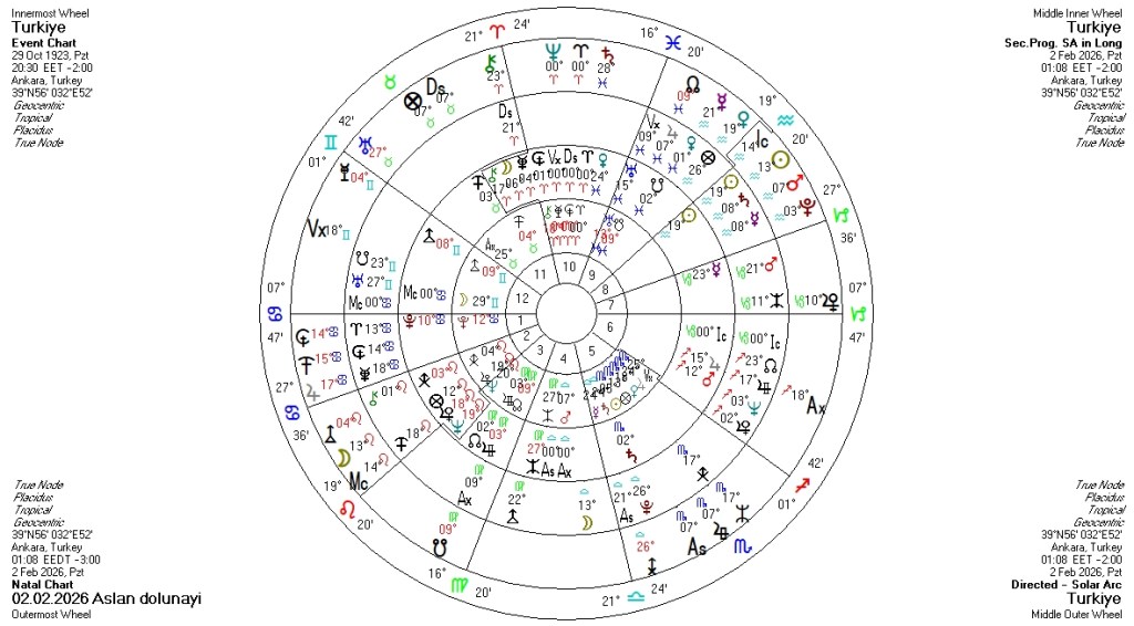 2 Şubat günü saat 01:08’de Aslan burcunun 13°03’ derecesinde dolunay meydana gelecek. Dolunaya ev sahipliği yapacak olan Aslan burcu liderlikle, sahnede ve gözler önünde olmakla, yaratıcı yönlerini ortaya koymakla ilgilidir. Gölgesinde müsriflik, gösteriş ve ego bulunur. Bu burç liderleri, yöneticileri, tanınmış kişileri, sanatçıları, yönetmenleri, organizatörleri, eğlence, reklam sektörünü, mimarlık ve iç dekorasyonu, kuyumcuları temsil eder. Dolayısıyla dolunay sürecinde Aslan burcunun doğasına has özellikleri ve bu gruplara ilişkin gelişmeleri daha belirgin görebiliriz.