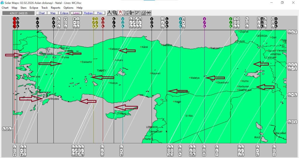 Yukarıda 2 Şubat günü Aslan burcunda gerçekleşecek dolunayın ülkemize ait astrokartografik haritasını görmektesiniz. Harita üzerinde işaretli hatlar ve çevreleri, tutulma enerjisinden daha belirgin etkilenmesi olası yerlerdir.