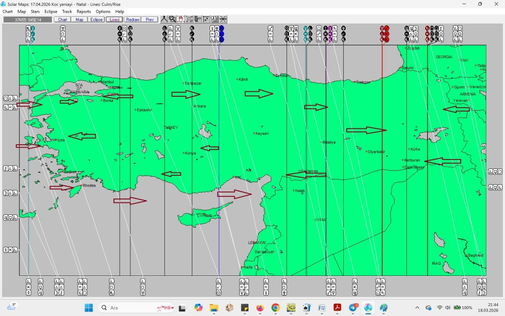 Yukarıda 17 Nisan günü Koç burcunda gerçekleşecek yeniayın ülkemize ait astrokartografik haritasını görmektesiniz. Harita üzerinde işaretli hatlar ve çevreleri, yeniay enerjisinden daha belirgin etkilenmesi olası yerlerdir.