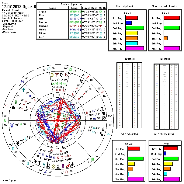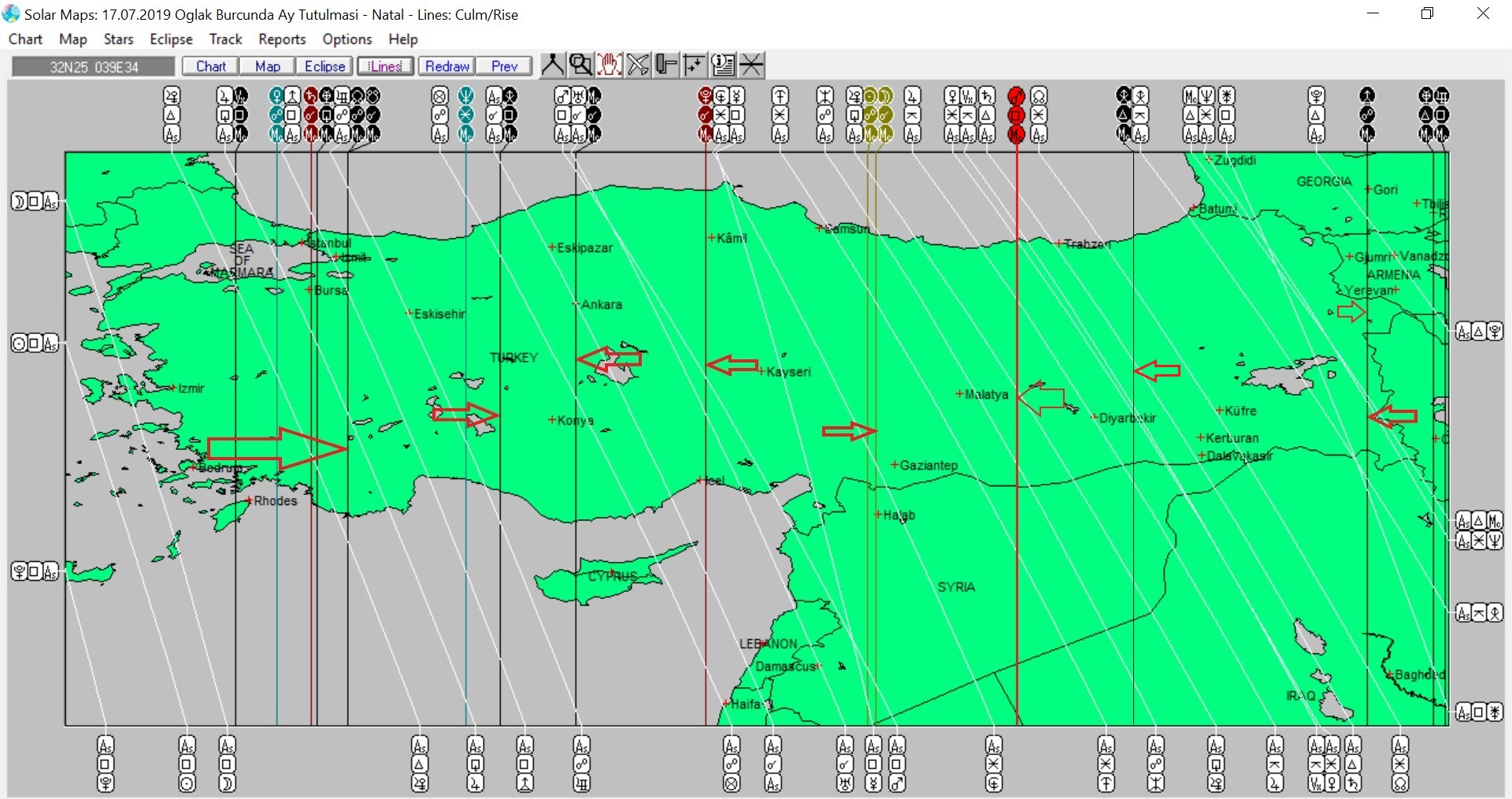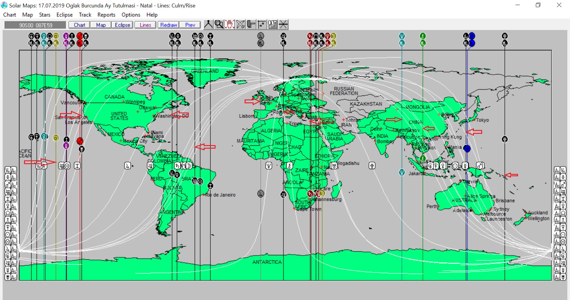 Yukarıda 17 Temmuz günü Oğlak burcunda meydana gelecek olan Ay tutulmasına ait ülkemizin, aşağıda ise dünya astrokartografik haritalarını görmektesiniz. Harita üzerinde renkli oklarla işaretli hatlar ve çevresi, tutulma enerjsiinden daha belirgin etkilenmesi olası yerlerdendir.